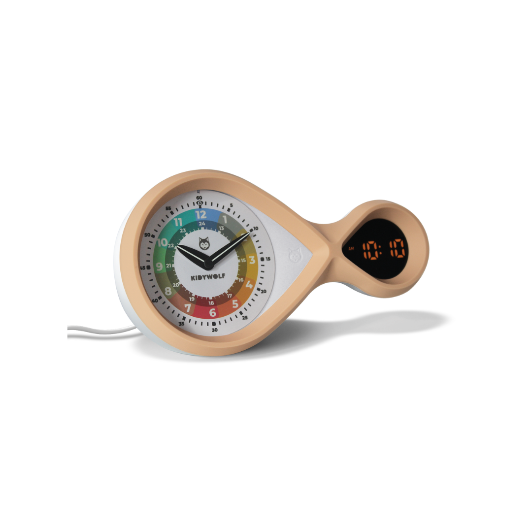 De KIDYALARM blijft verbonden via USB-C, waardoor er geen batterijen nodig zijn en heeft een afstelbaar alarm met snooze-functie.
