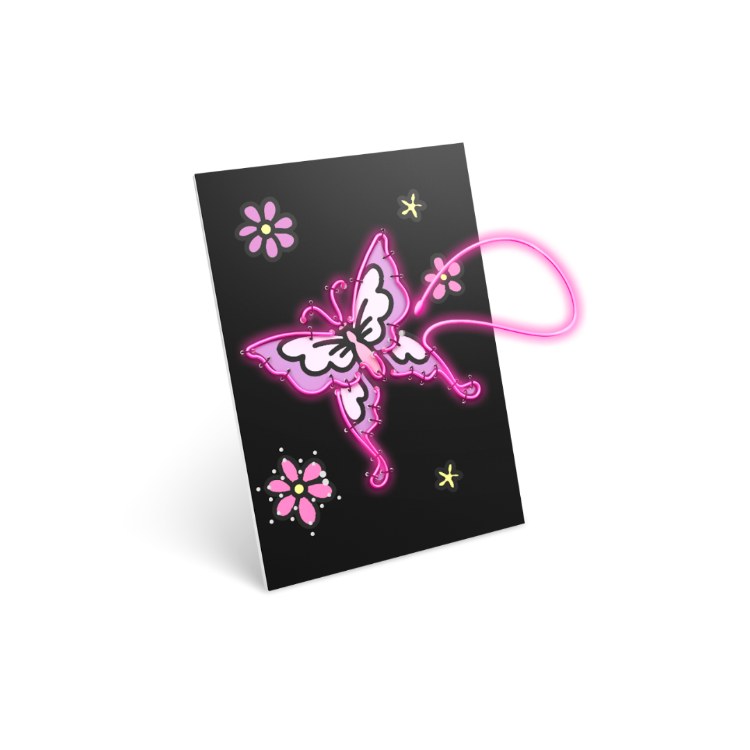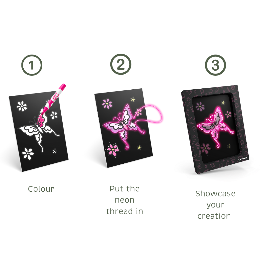 KIDYNEON réinvente les loisirs créatifs en ajoutant une touche de magie lumineuse ! Grâce à un fil effet néon à insérer dans une planche pré-perforée, les enfants réalisent des tableaux brillants, originaux et fièrement exposables. Une activité manuelle qui stimule la créativité tout en développant la motricité fine et la concentration. Sans écran, 100 % captivant !
